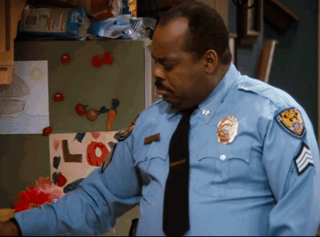 We’re in the kitchen, and Carl is venting to Harriette about how his children don’t listen to him. Eddie was supposed to empty the incinerator, but didn’t. I honestly didn’t think I would ever think about an incinerator again, but since we’re talking about defunct nineties shit, here’s a picture of the sweater Harriette was wearing in this scene. Every single person who grew up in the nineties had a sweater that looked precisely like this, and they looked good on exactly no one. Harriette informs Carl that Eddie said to inform him that something came up, and he’d empty it tomorrow. Carl goes into a long soliloquy about how everything with Eddie is “Tomorrow, Dad!” At this point, I was saying to myself, “Here we go. Yet another episode where Carl and Eddie have to learn to appreciate each other,” but this one is going take a huge swerve left. In fact, Eddie isn’t in this episode at all! To further cement the “Carl is irritated with his family” bit they’re going for right now, Carl goes into the fridge and finds that both his first and second choice of beverages are missing. After bitching about that for a spell (including an admittedly hilarious bit in which he holds up an empty milk carton and says, “Which one of our gangster children did this?*”), Carl spots a pickle jar with one pickle left in it on the counter. If he were to ask why these weren’t being refrigerated, I’d have backed him so hard, but the man just wants a pickle. Because this isn’t his day, he has an extremely difficult time with it, but Carl is nothing if not a problem solver: